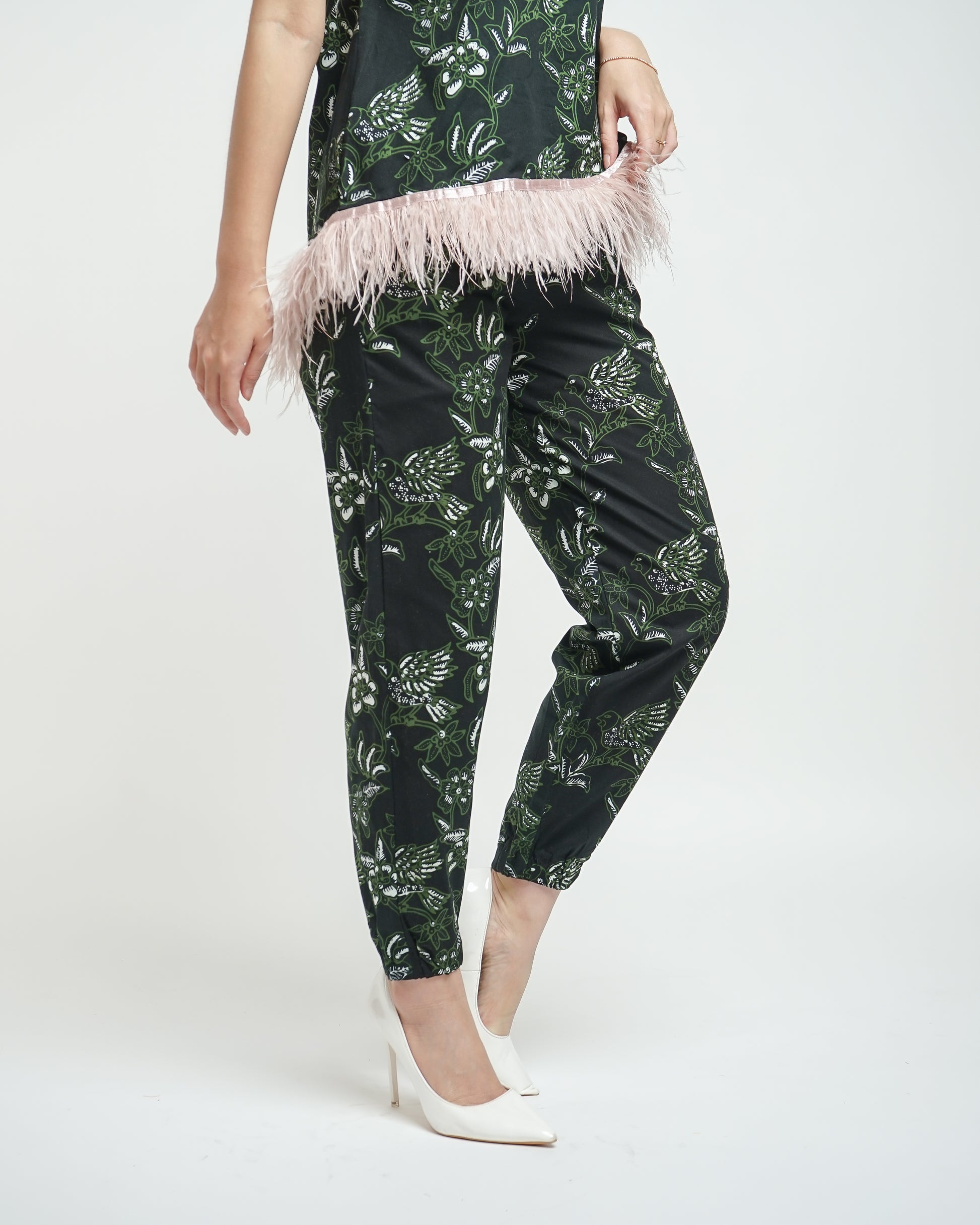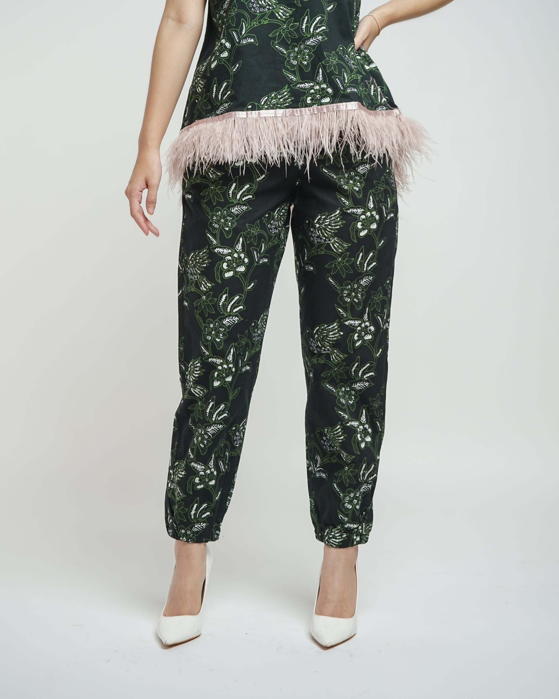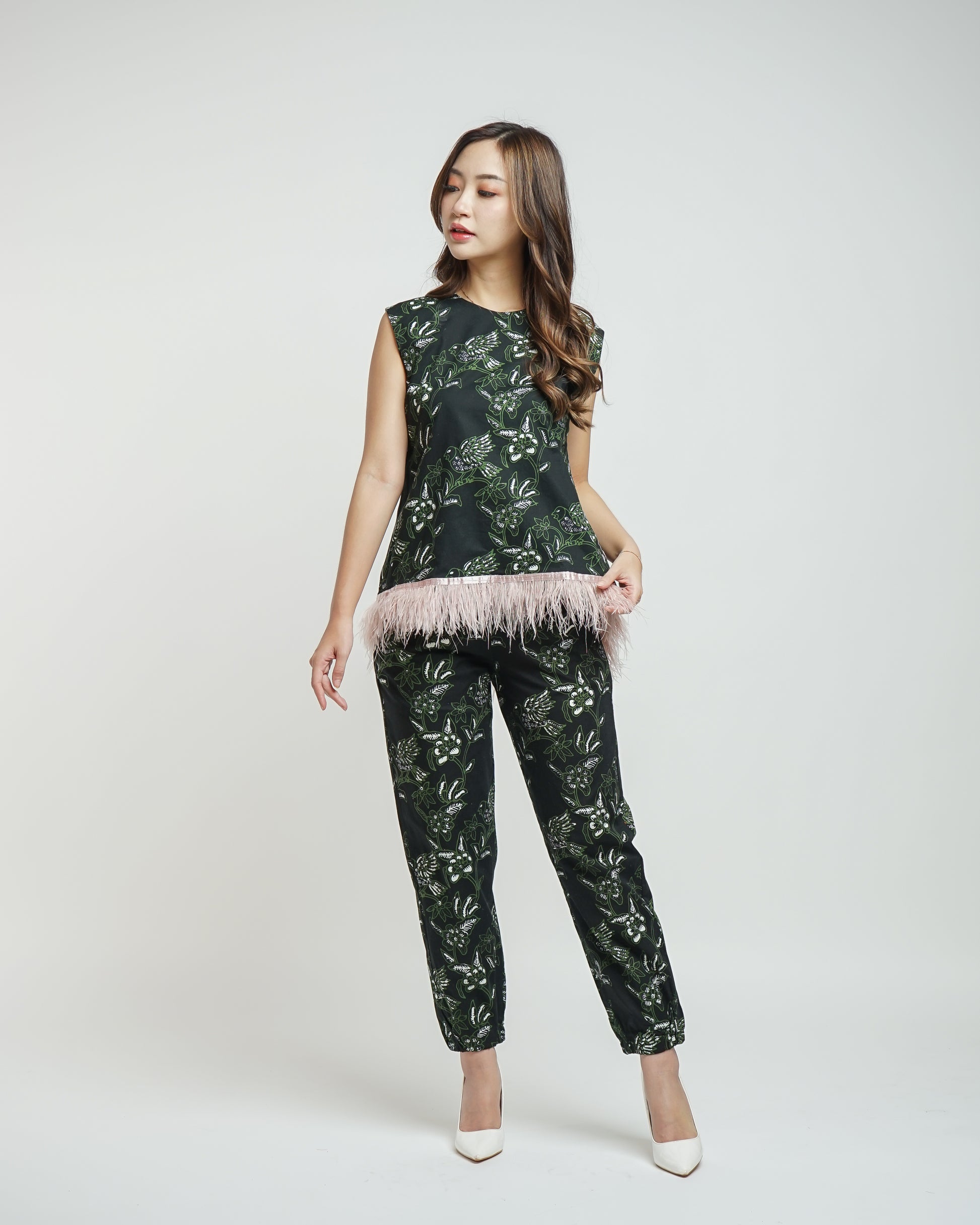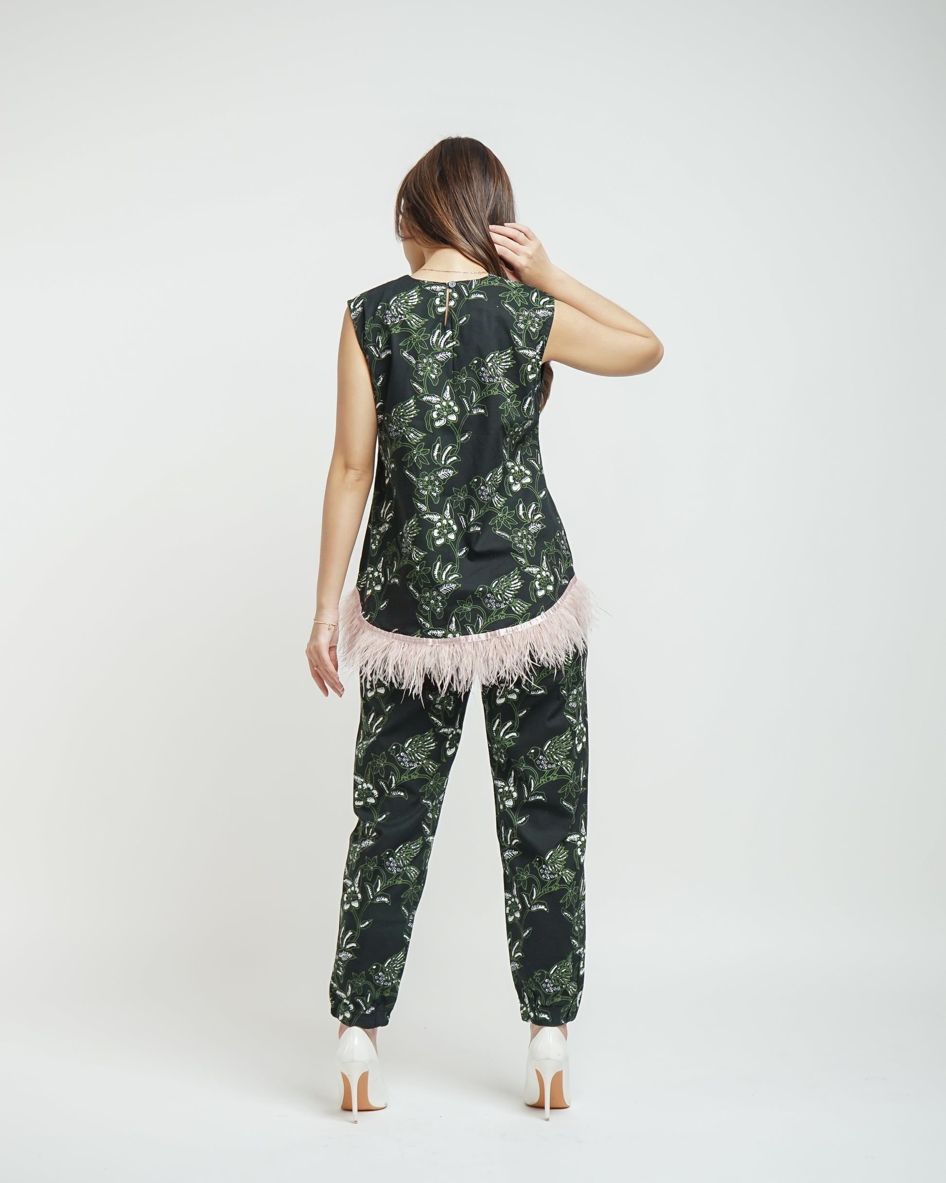 Audrey sleeveless top with dramatic blush ostrich feather at hem for that glamour accent. Made with original motif of batik hand-stamped.