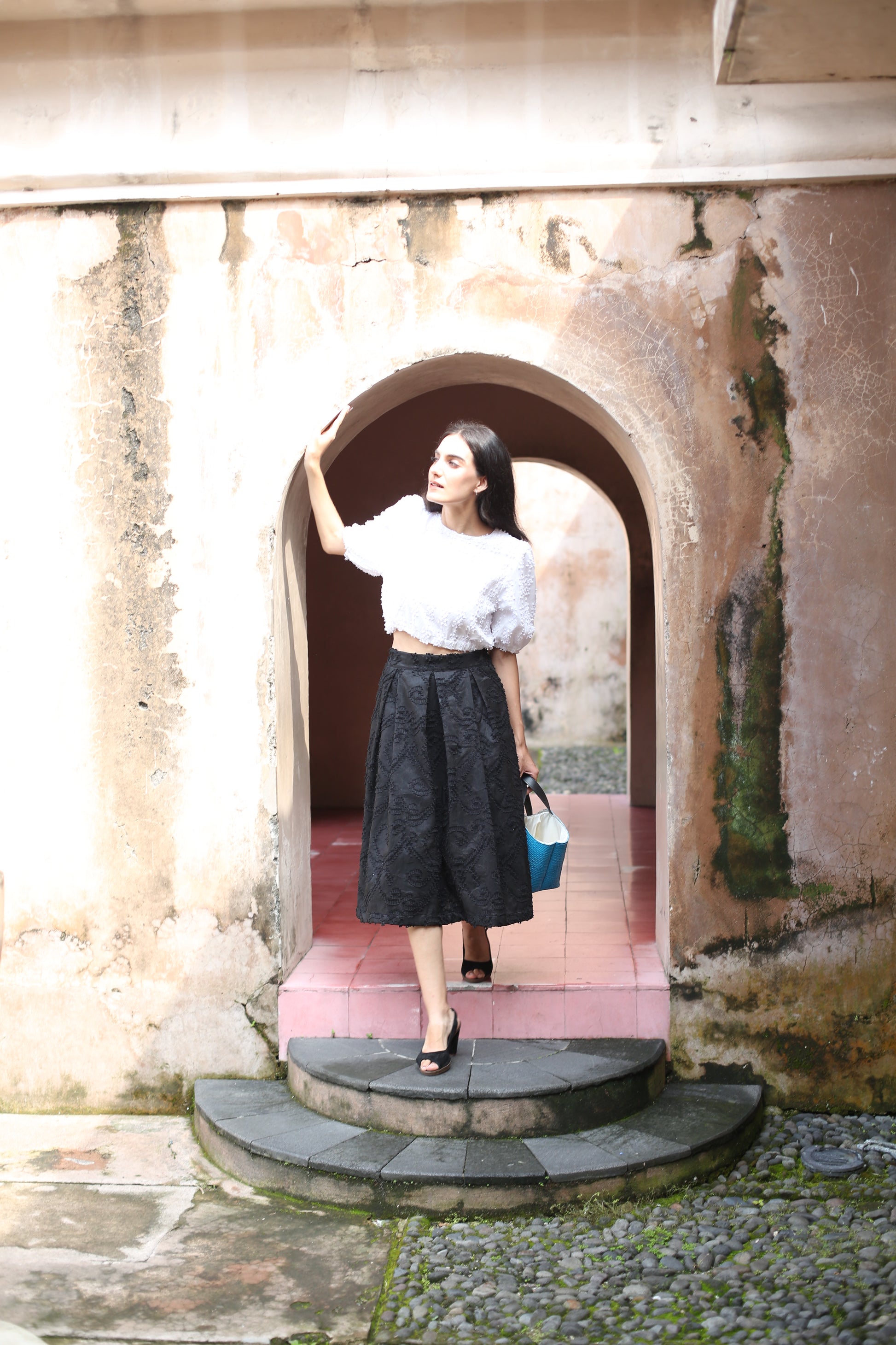 Caitlyn skirt, made of handwoven fabric of Java with epitomi exclusive pattern. Designed with A-line cut for easy, modern day wear and pleats for a slimming silhouette. Stretchy at waist to for comfort and comes with two pockets.