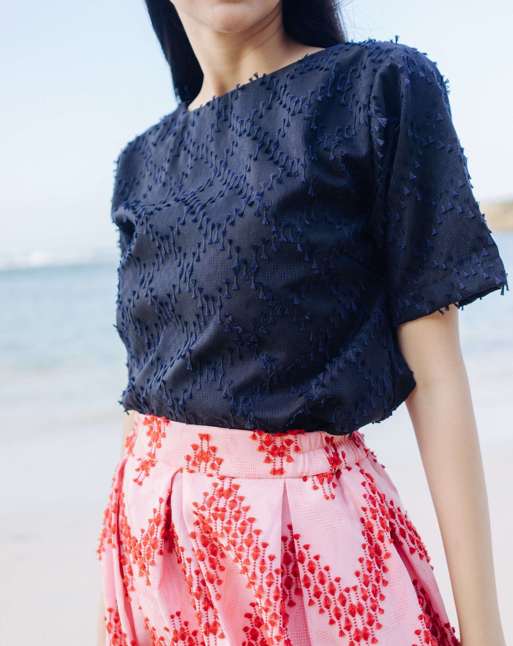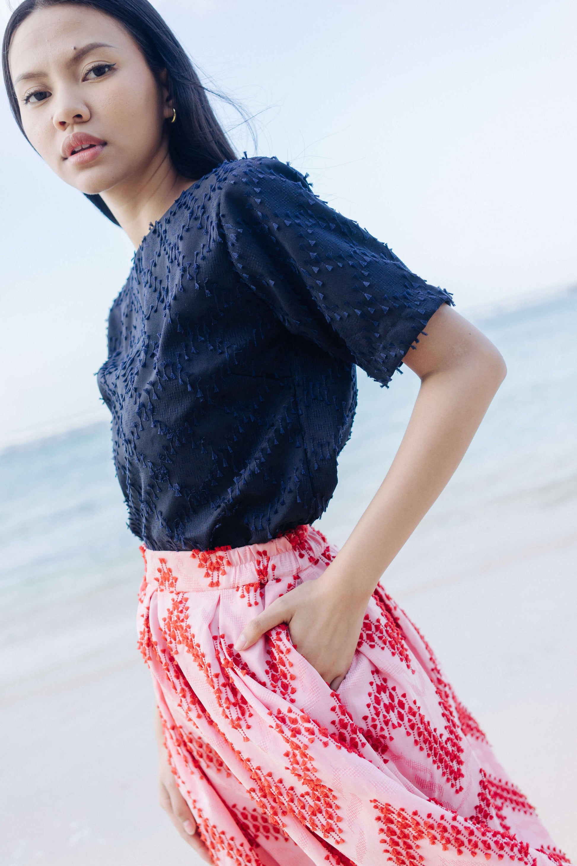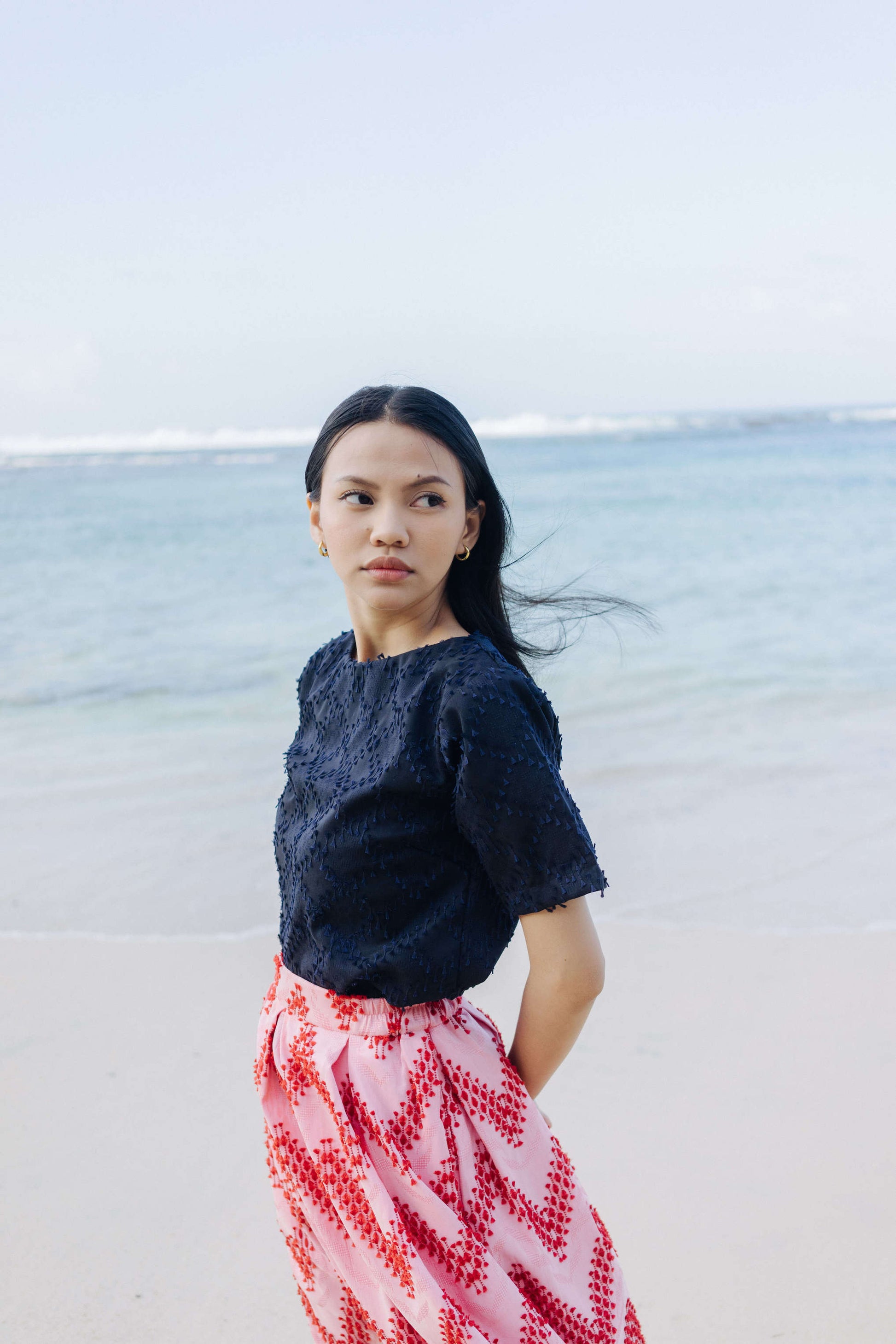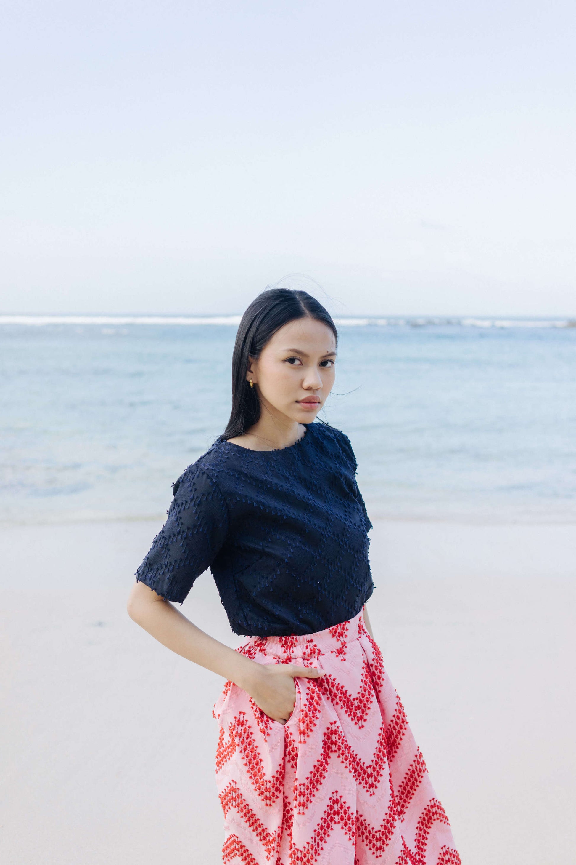 Devina top with slim boat neck for the modern flair, made with handwoven tenun ATBM and feathery accent.