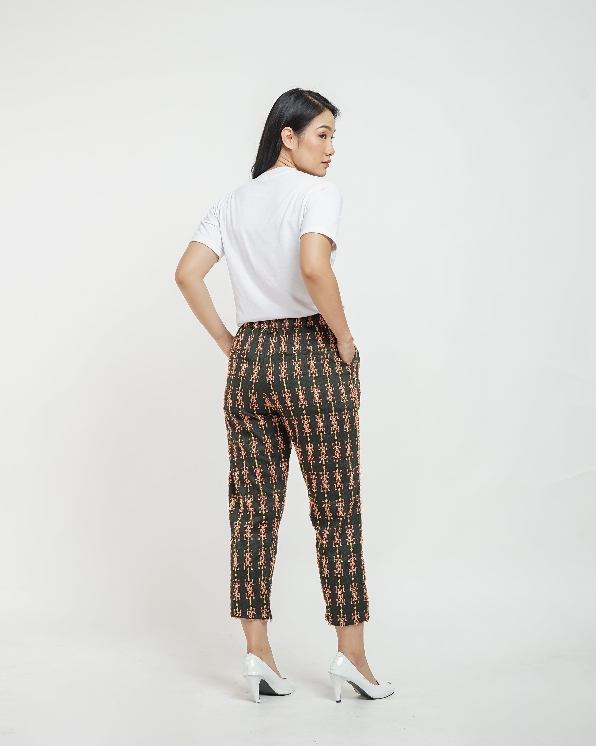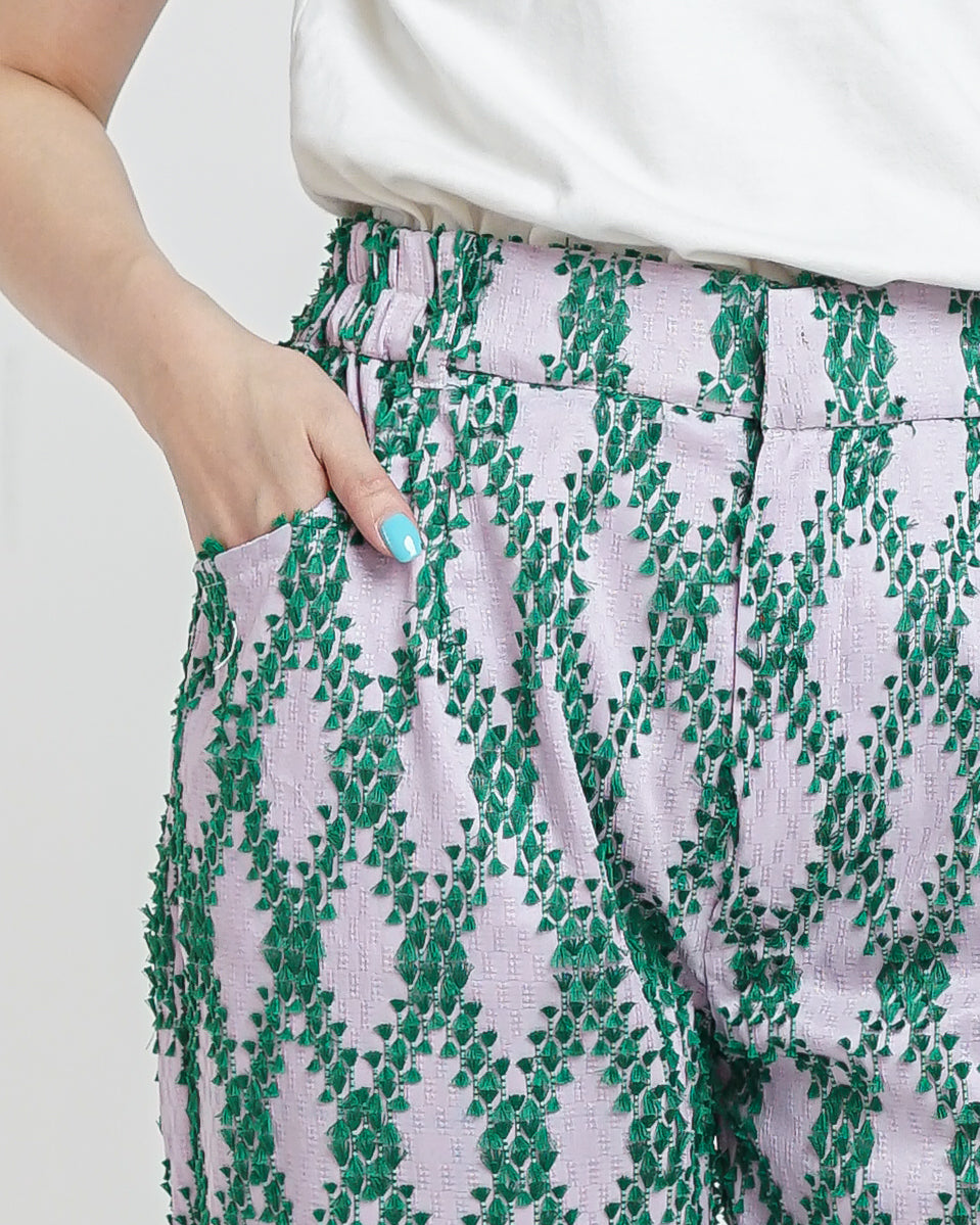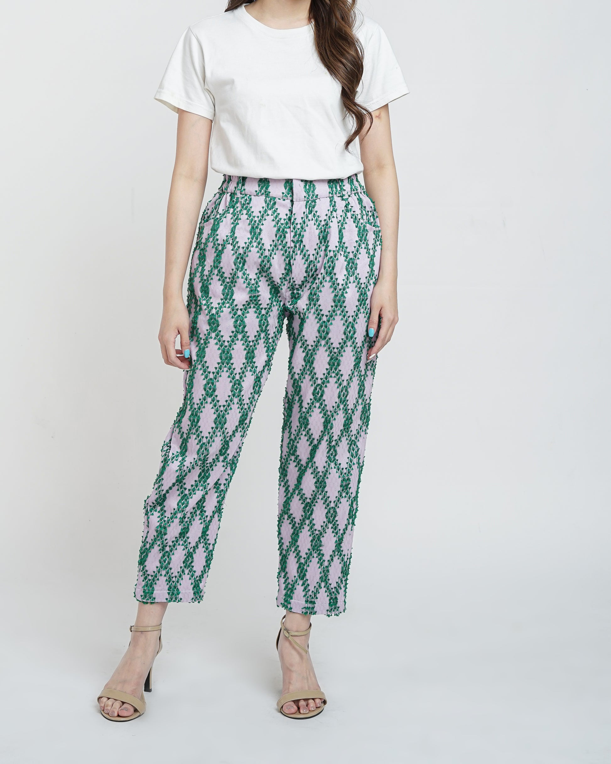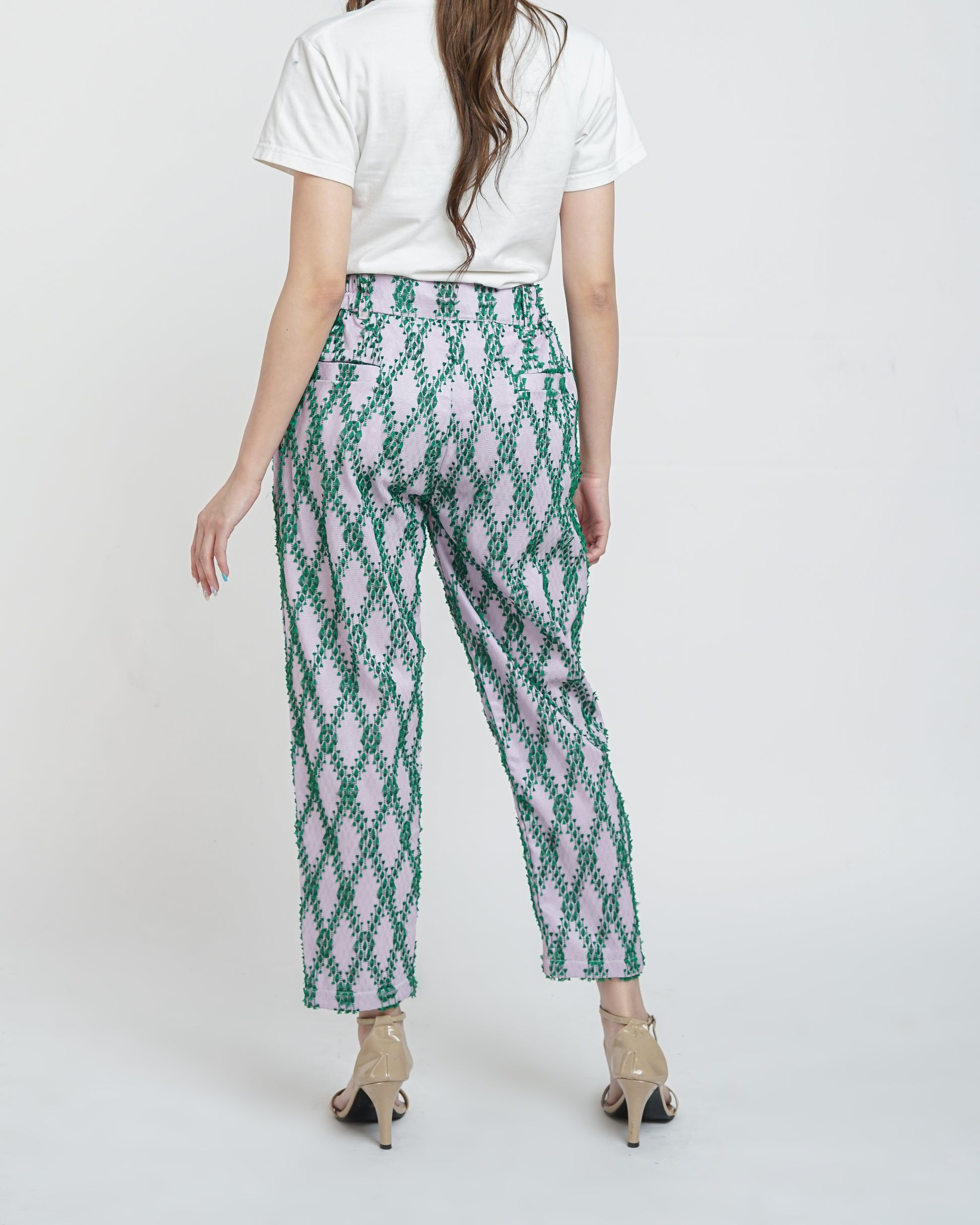 Taylor ankle pants made of handwoven heritage fabric with feathery details.