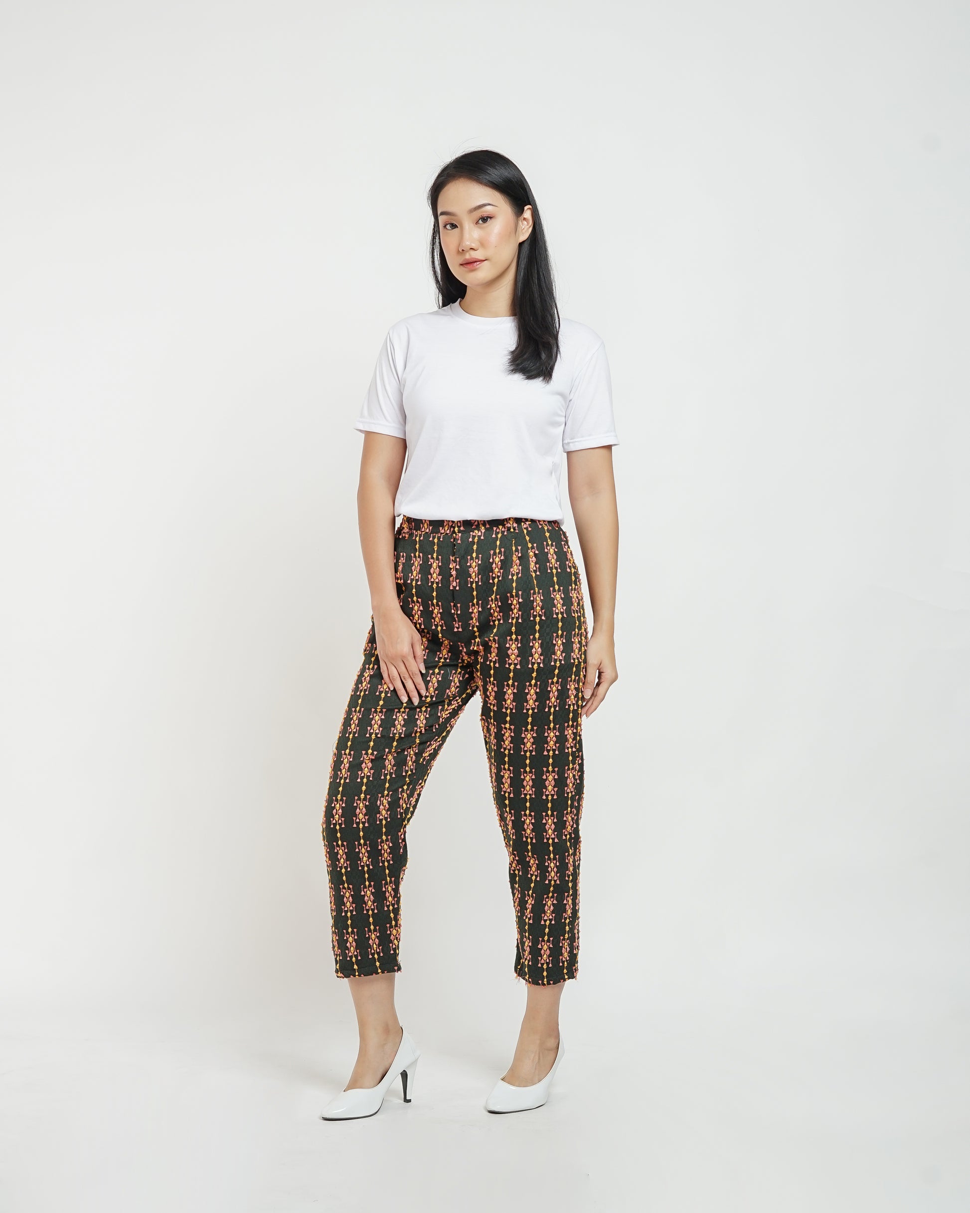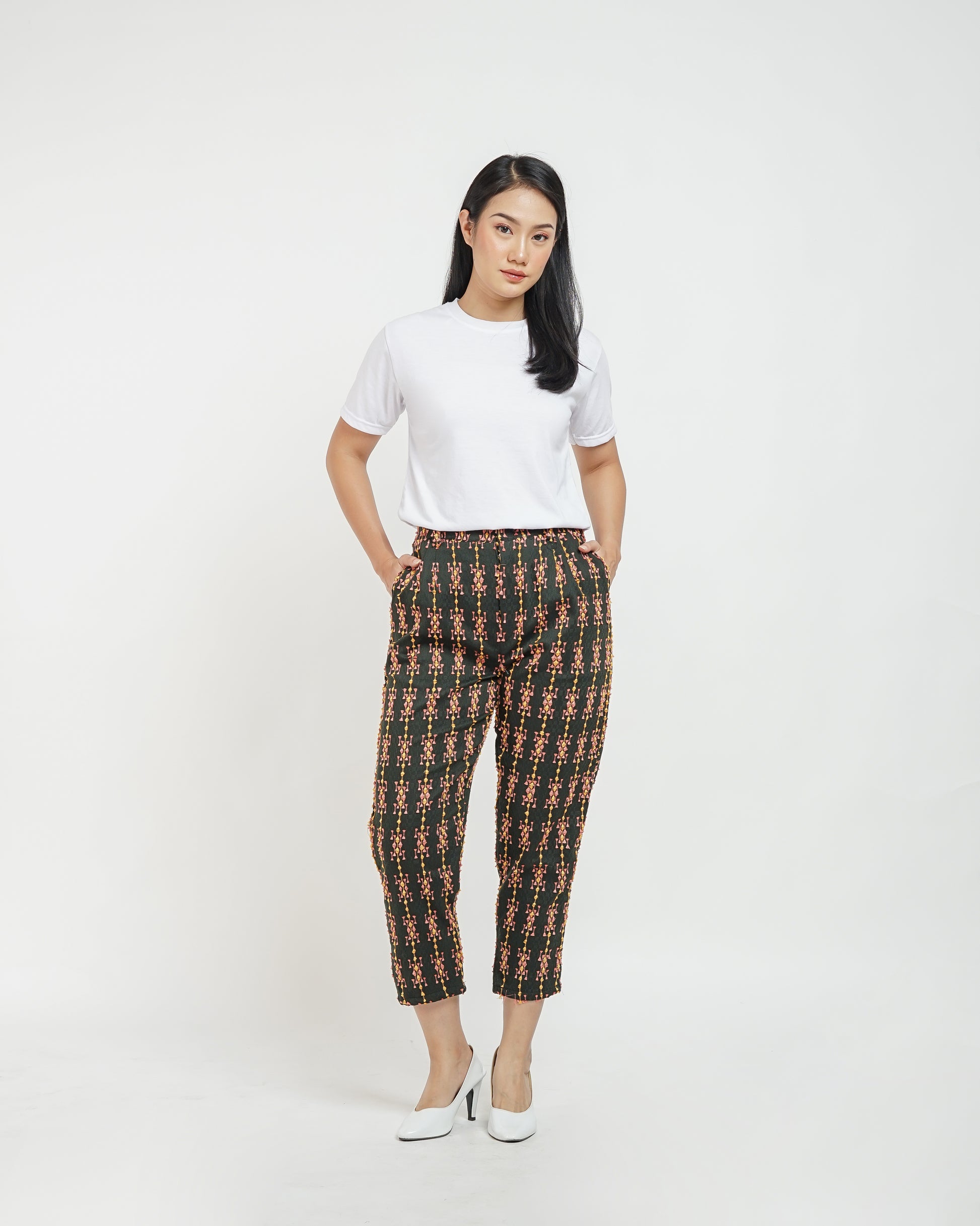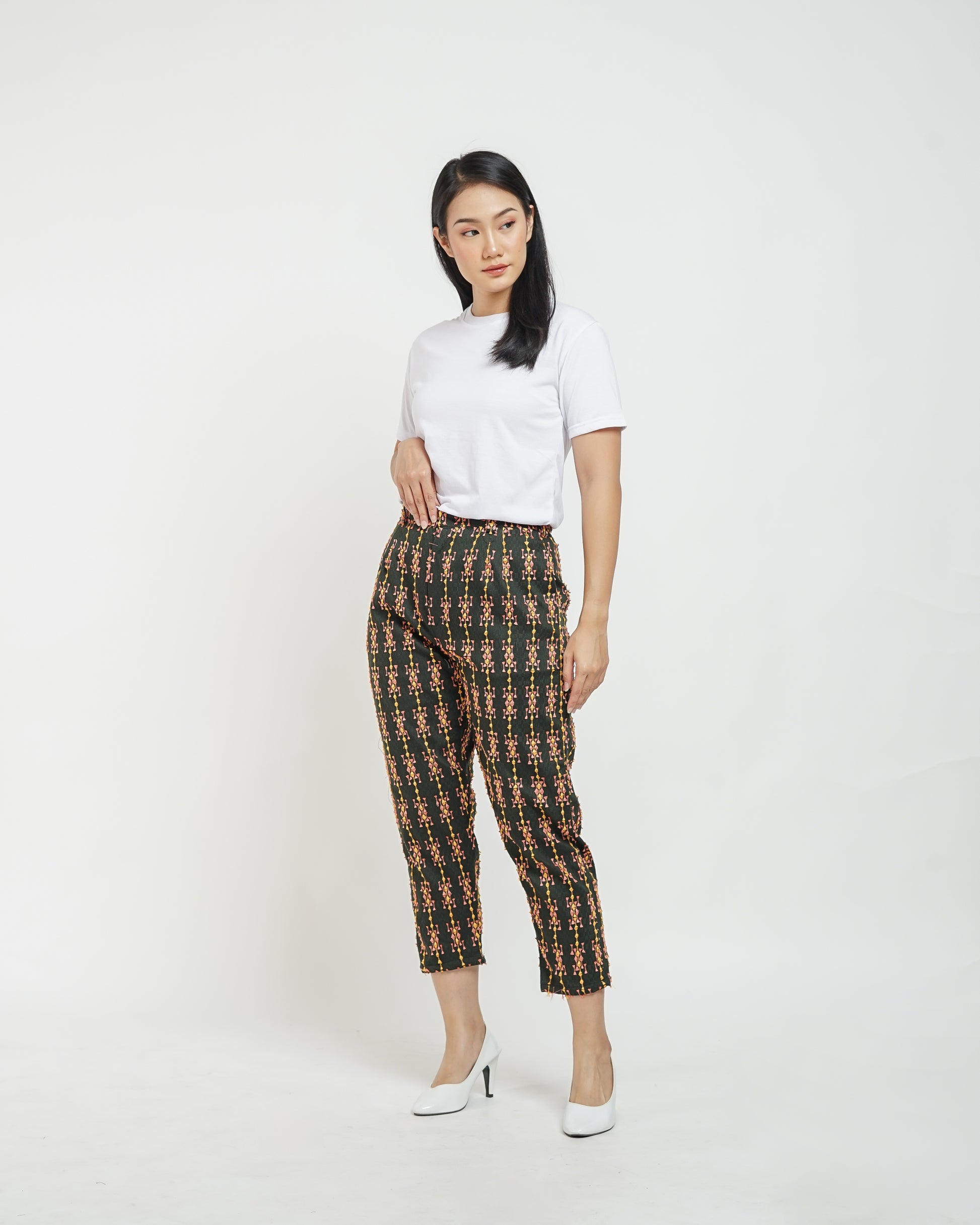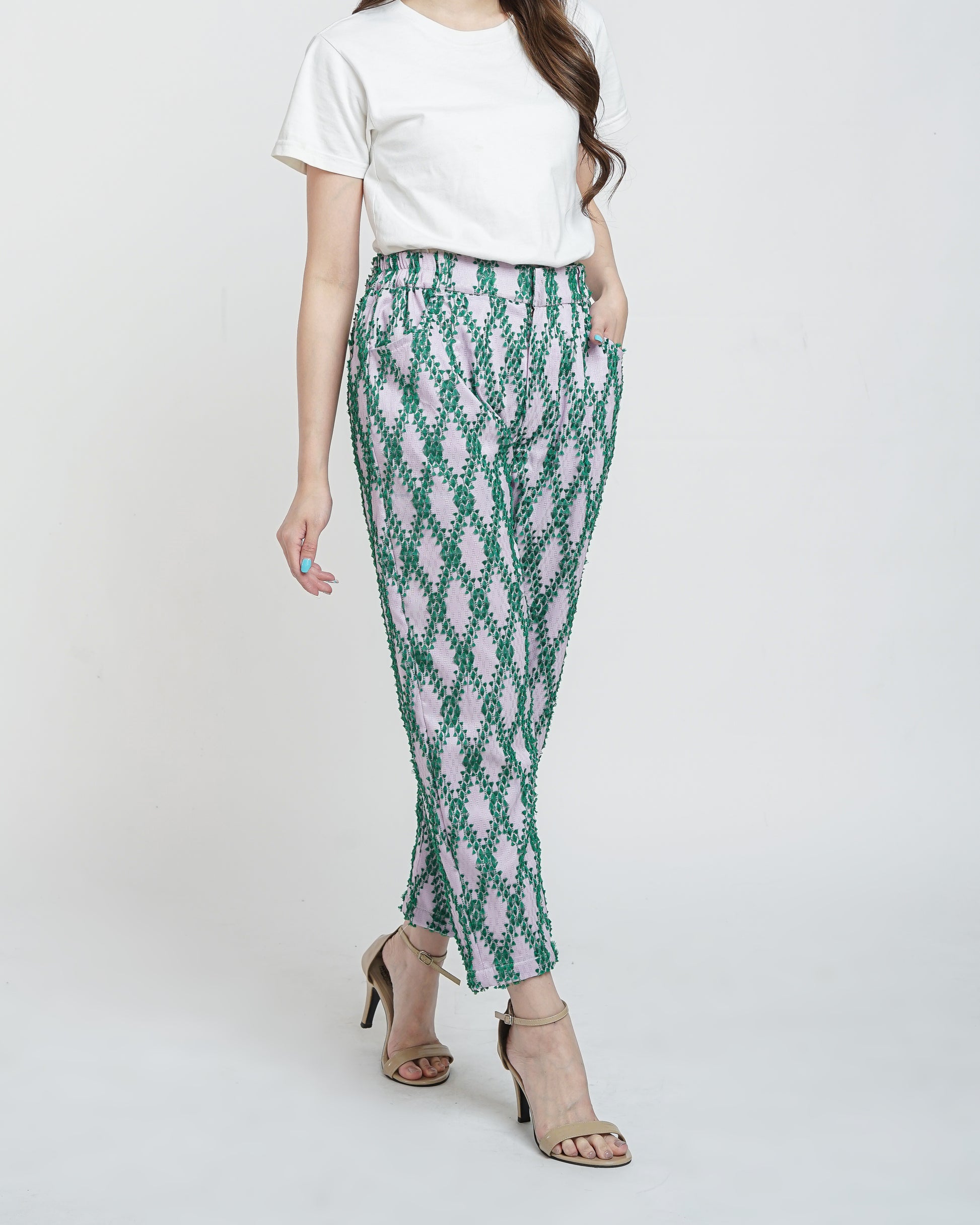 Taylor ankle pants made of handwoven heritage fabric with feathery details.