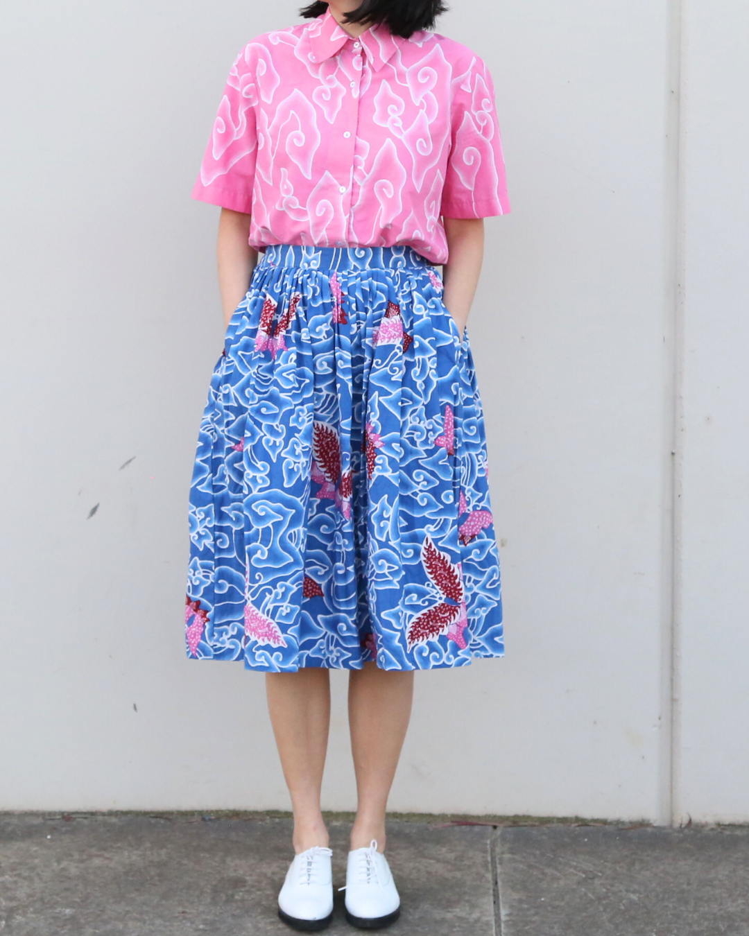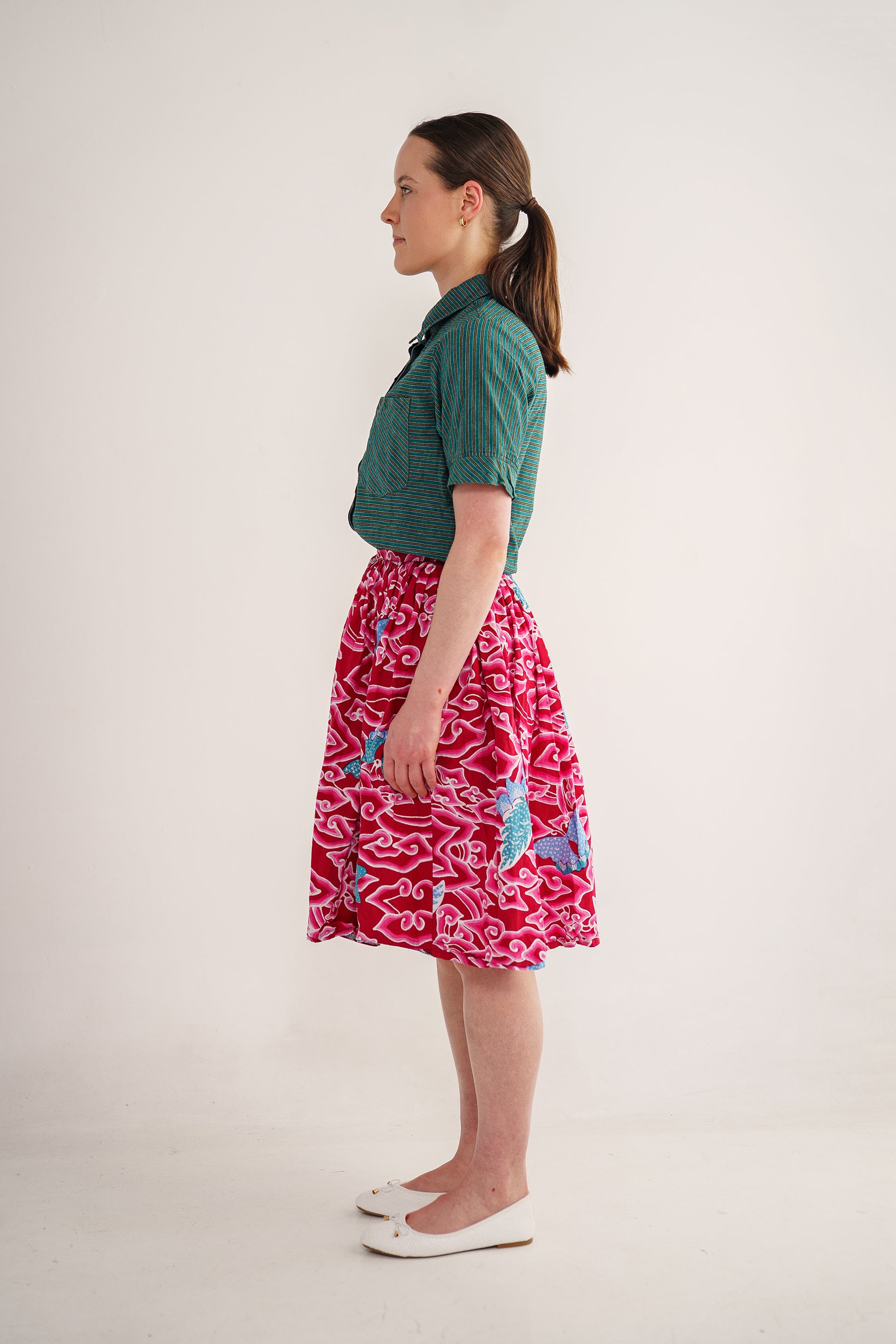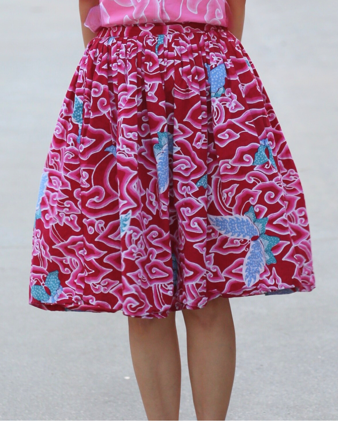 Elevate your wardrobe with this exquisite A-line skirt crafted from authentic batik tulis Mega Mendung, a traditional Javanese cloud motif reimagined with delicate butterflies in vibrant fuchsia and blue.