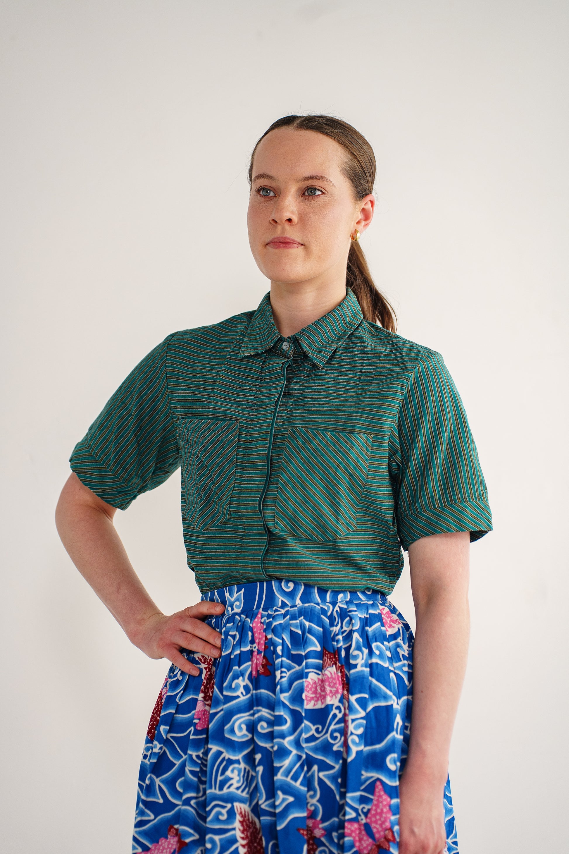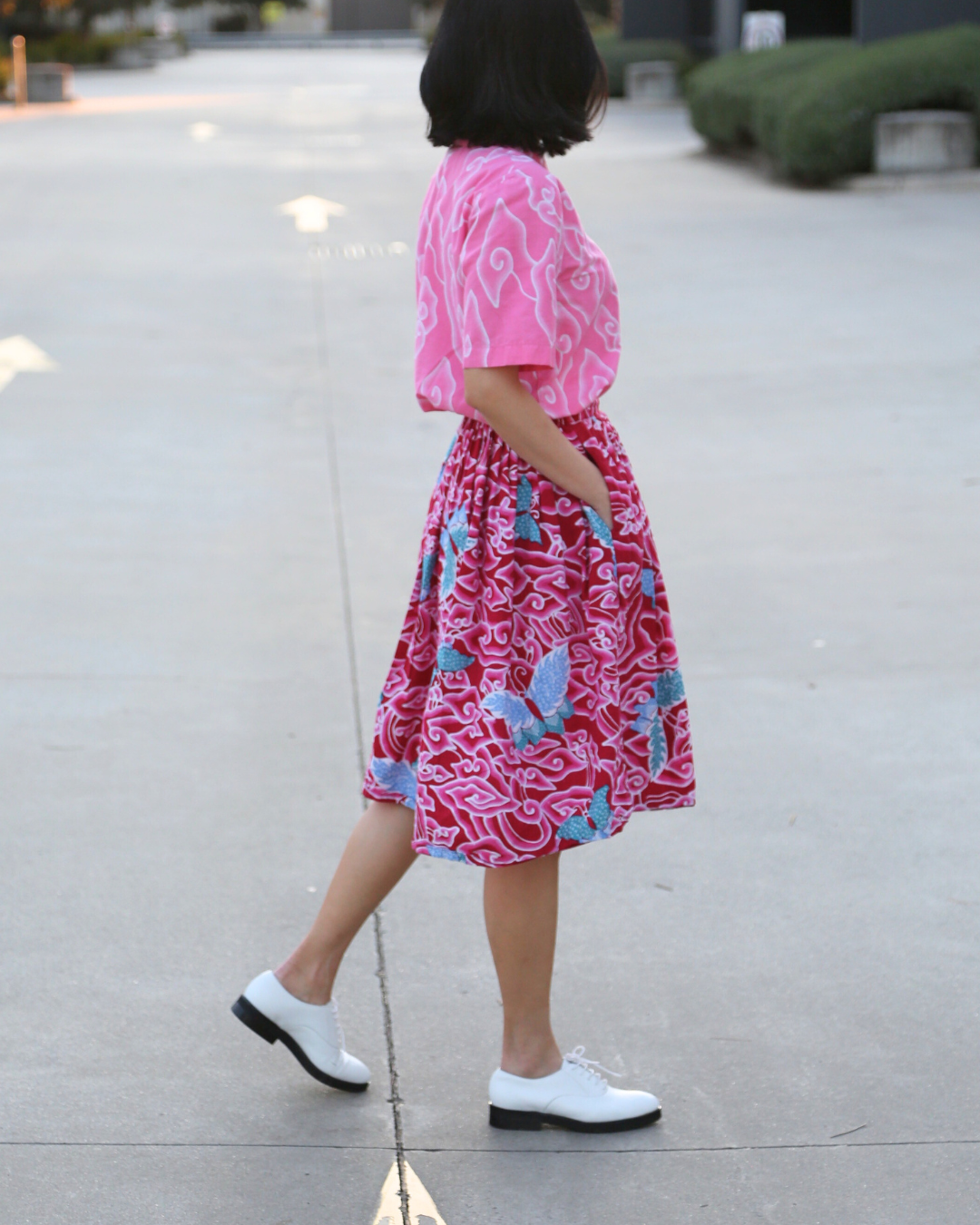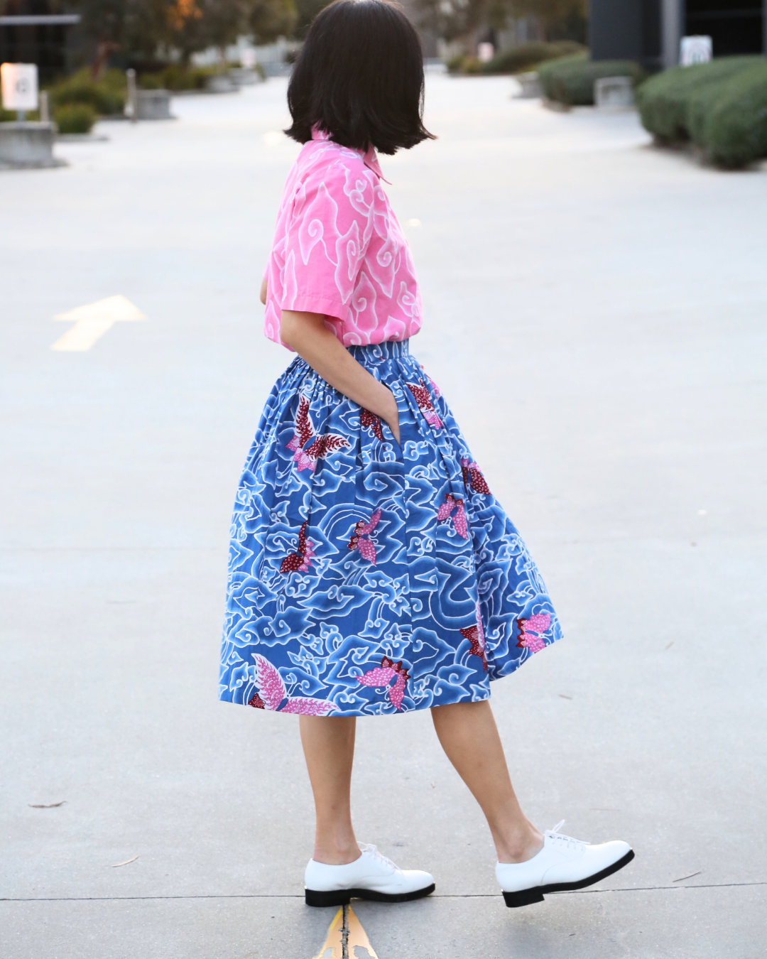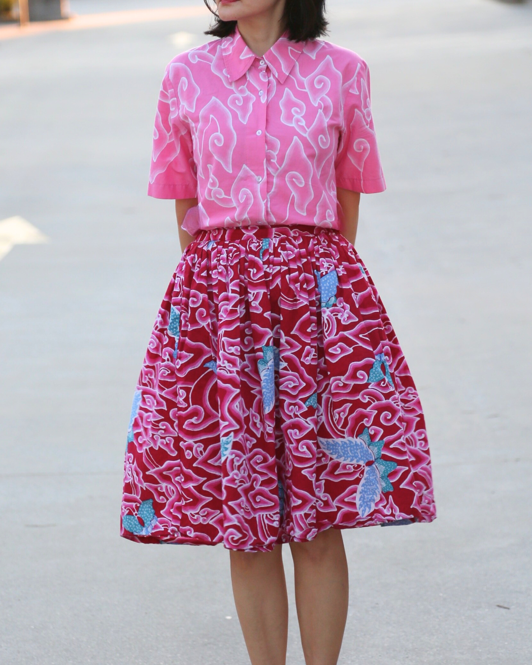 Elevate your wardrobe with this exquisite A-line skirt crafted from authentic batik tulis Mega Mendung, a traditional Javanese cloud motif reimagined with delicate butterflies in vibrant fuchsia and blue.